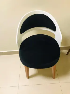 “An open back wooden chair designed with modern lines. The chair is made of beech wood with white color with intailed indigo blue leather back and the base is made of leather upholstery in indigo blue color with high-density foam filling for the greatest comfort. Fixed wooden legs for a solid base.