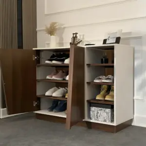 “This elegant shoe rack is the perfect solution to organize your shoes in style and order. With a practical design that ensures space saving and easy access, you can add a luxurious touch to the entrance of your home.