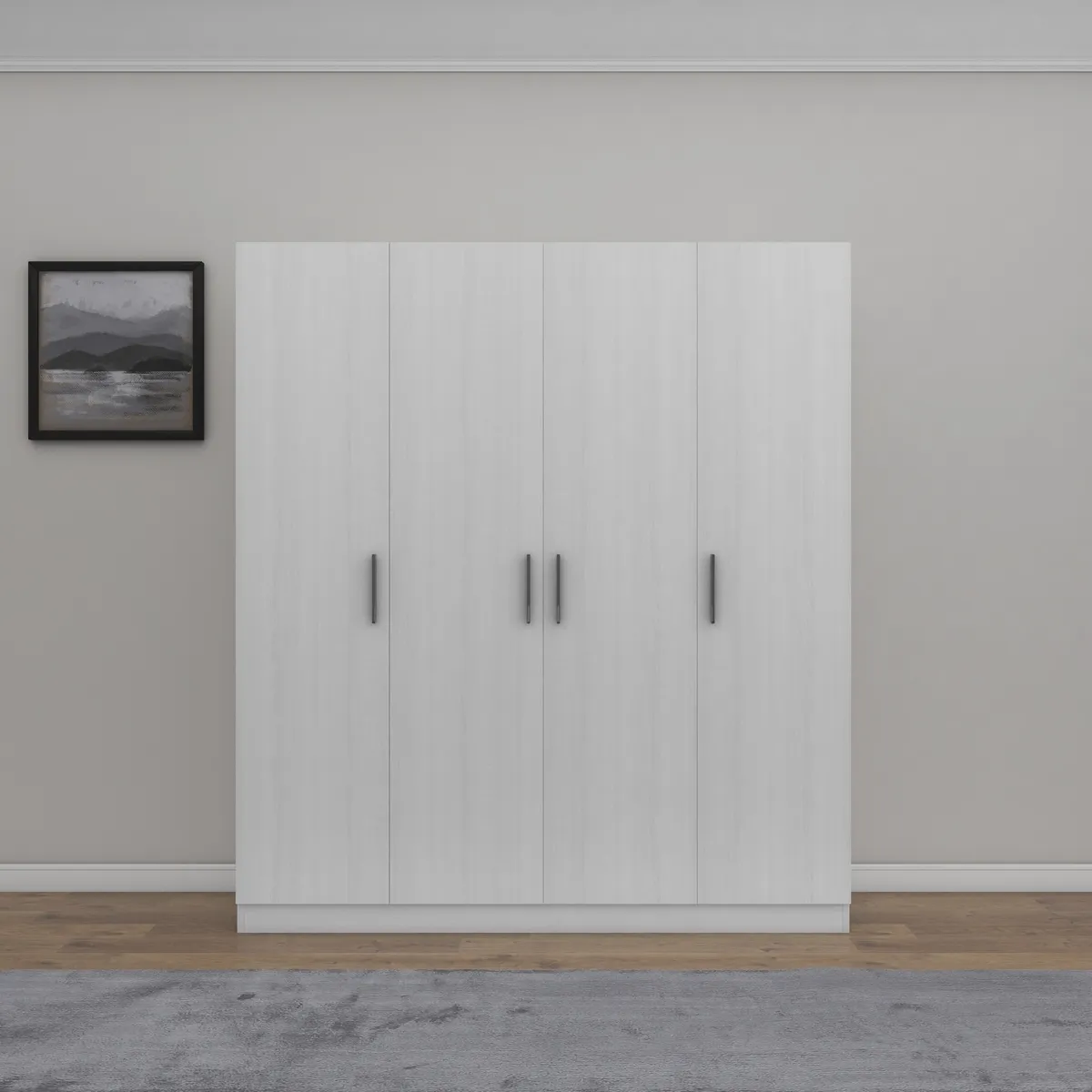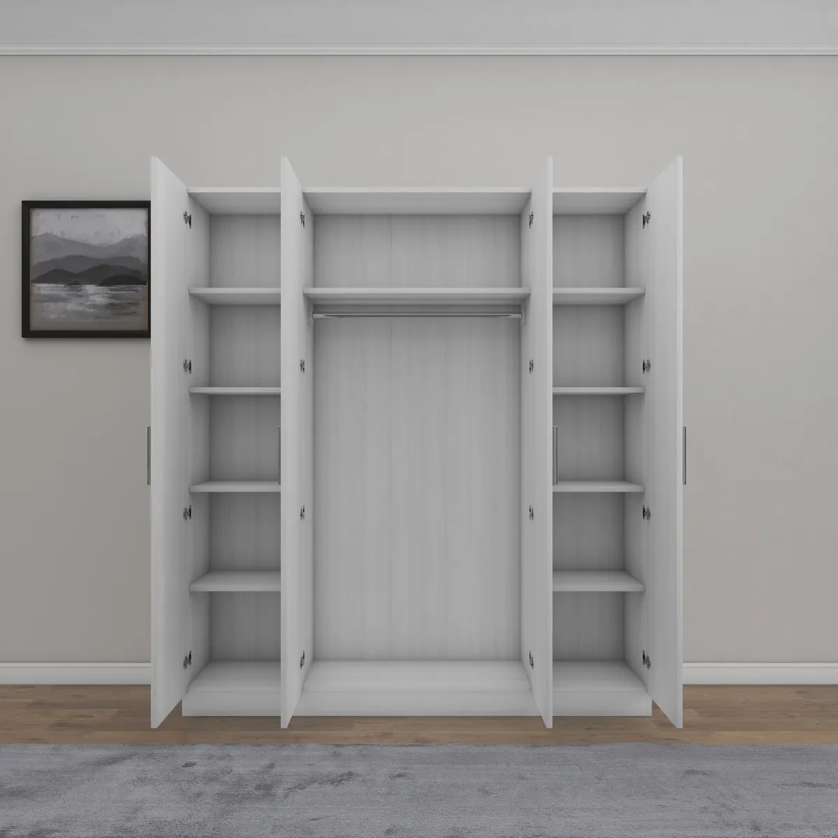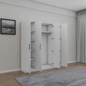“A distinctive wardrobe with a modern design that combines elegance and practicality, providing ample storage space for organizing clothes or personal items, with elegant details that add a sophisticated touch to any room and make organization easier and more beautiful.