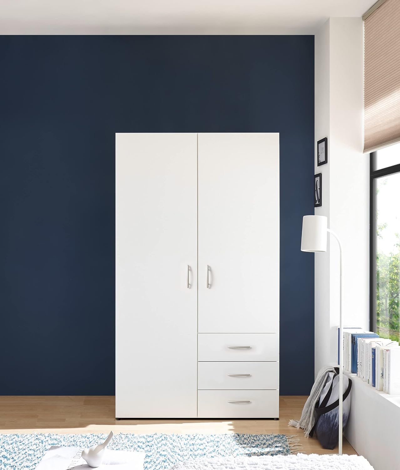 “A distinctive wardrobe with a modern design that combines elegance and practicality, providing ample storage space for organizing clothes or personal items, with elegant details that add a sophisticated touch to any room and make organization easier and more beautiful.