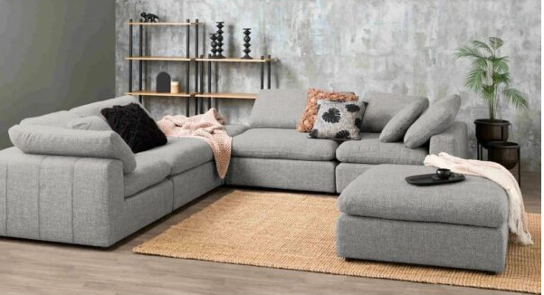This living room set has a modern and minimalist look. The light gray color scheme and clean lines create a sense of order and make the space appear bright and airy.